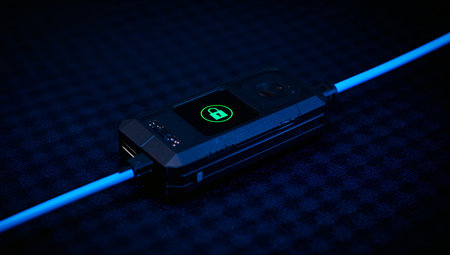 A rugged, high-tech security dongle featuring a glowing green lock icon on its display, connected by a blue illuminated cable. The moody, dark blue setting conveys cybersecurity and data protection, ideal for marketing hardware authentication and secure access solutions. Suitable for tech campaigns, product pages, and cybersecurity advertising.