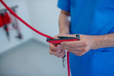 Rehabilitation equipment. Male strong hands holding red strap and attaching retainer to it for rehabilitation procedures in room.