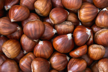 Texture of chestnuts on a pile, autumn pattern wallpaper