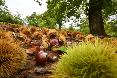 Wwild Forest Chestnuts with Shell and Thorns Autumn Harvest