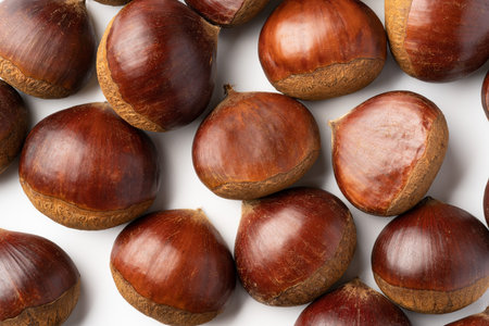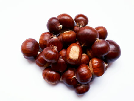 BaStudio shot of chestnuts with matte and glossy skin on white background. Autumn hues and natural texture form a lively backdrop for food stories and autumn gift advertising.