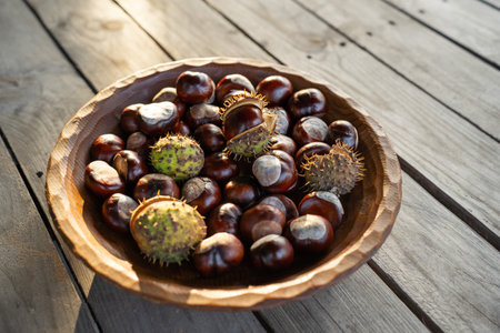 Chestnuts in a wooden bowl on a wooden background. Autumn harvest.
