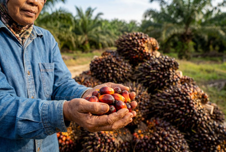 An older asian female farmer in a denim shirt holds a handful of fresh red and orange palm oil fruits standing before a pile of harvested bunches at an agricultural plantation outdoors.