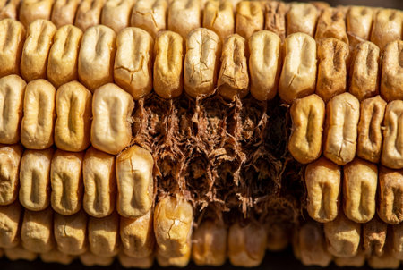 A close up photograph showing the textured surface of a dried corn cob with several kernels missing, revealing the core structure beneath