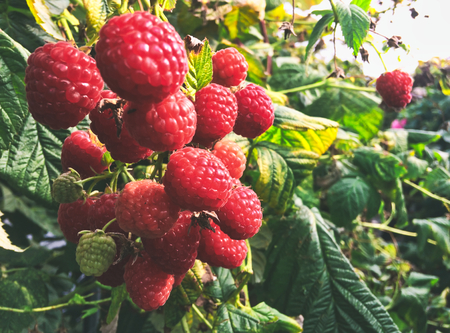 Closeup of growing organic raspberries. Ripe Raspberry in the fruit garden. Selective focus.
