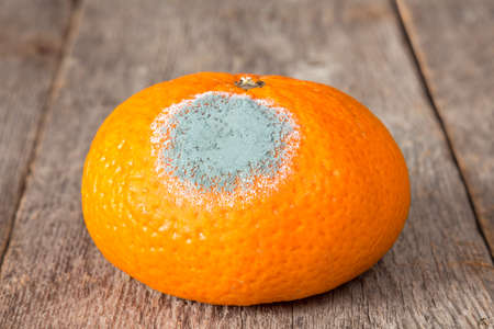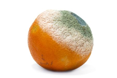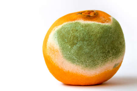 Rotten orange with mold on light background, Close Up. Ugly food consept expired fruit.