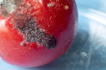 Mold Aspergillus fumigatus on a red tomato. Laboratory research of food products.
