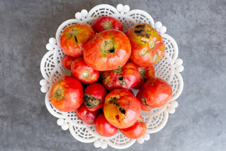 Diseased and damaged tomatoes eaten by caterpillars are stacked in a bowl, problems with the harvest. Fight against cutworm.