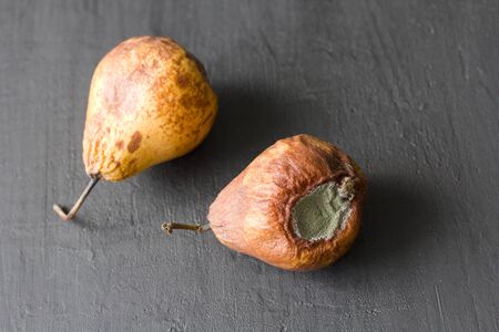 Rotten spoiled rotten fruits, pears. Rotten pears on a black dark background. Damaged products, mold. Copy space for your text. Still life fruit.