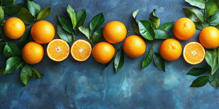 Vibrant still life featuring fresh juicy oranges against blue
