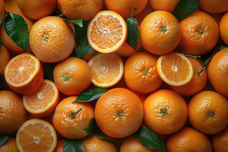 A stunning arrangement of whole and sliced oranges is beautifully complemented by lush green leaves, evoking a sense of freshness and vitality. The bright orange hues and the glossy leaves create a lively atmosphere, perfect for showcasing the essence of natures bounty.