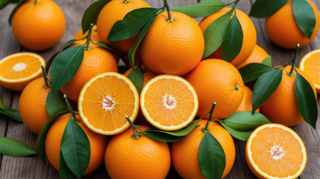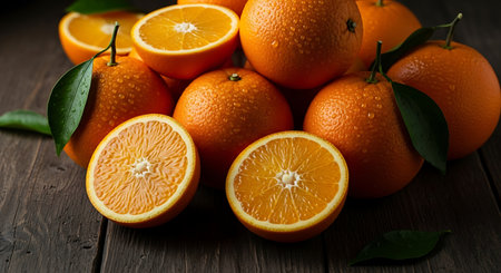 Bright oranges, whole and halved, showcasing juicy citrus vibrance and freshness, beautifully rendered by Generative AI