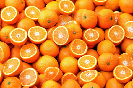 Bright fresh orange wedges arranged neatly to create a vibrant citrus background for food and advertising design.