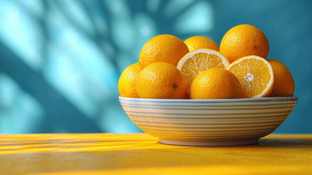 A visually appealing arrangement of fresh oranges on a colorful background, perfect for use in health, nutrition, or food-related projects. Bright and vibrant!