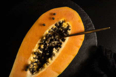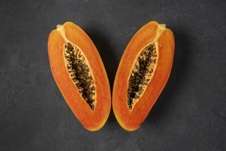 Ripe and freshly cut papaya. Fresh and tropical fruit with dark background