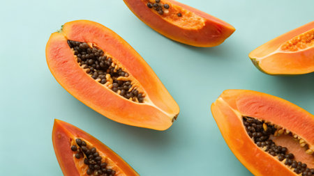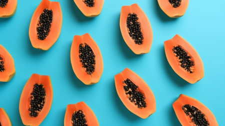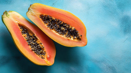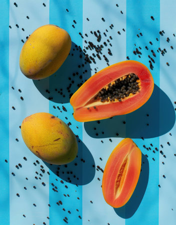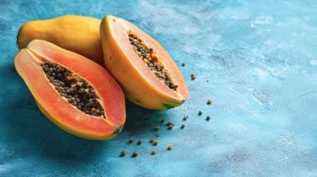 Fresh papaya fruits on a bright blue striped background with scattered seeds, highlighting their vibrant color and tropical essence.