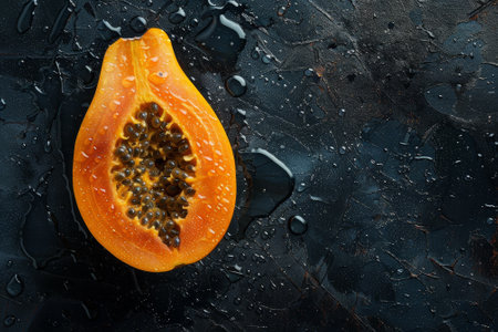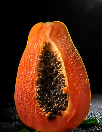 Close-up of fresh Papaya Fruit with water drops on a pitch solid black background