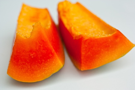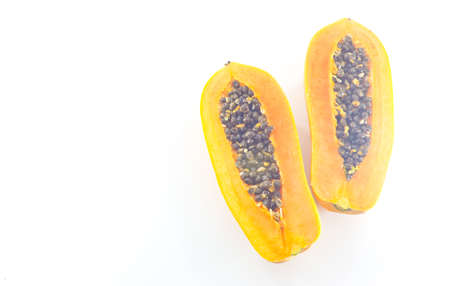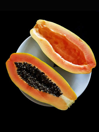 Half cut ripe papaya with seed on a white plate. Slices of sweet papaya with a white background. Halved papayas. Healthy exotic fruits. Vegetarian food