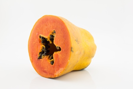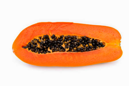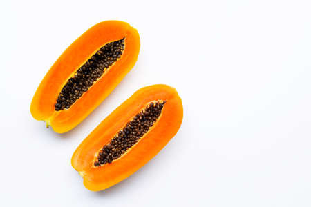 Ripe and freshly cut papaya with its seeds and white background. Fresh and tropical fruit