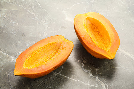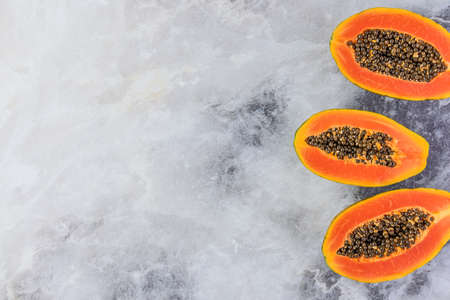Three halves of ripe papaya on a gray marble background. Top view, copy space.