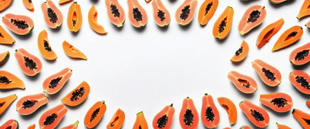 Cut papaya with seeds on white in frame form. Healthy fruit. Top view flat lay. Copy space text area. Generative AI