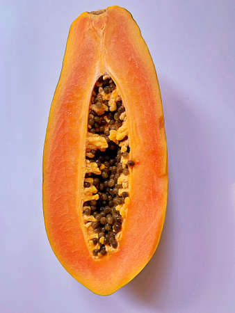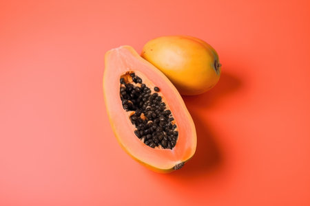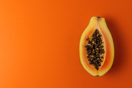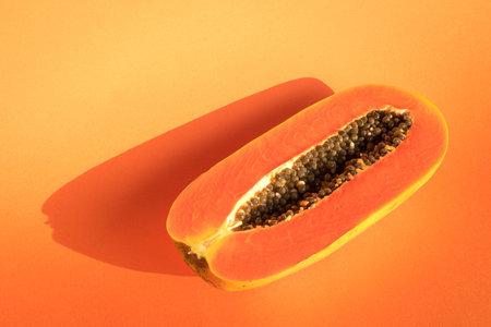 Ripe papaya fruit cut into half on orange background. Summertime concept.
