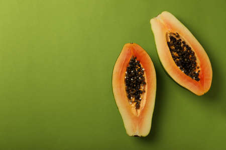 Papaya fruit over green background, half of fresh exotic fruits with seeds. Halved fresh organic Papaya exotic fruit art design, close up. Top view, flat lay, vertical image