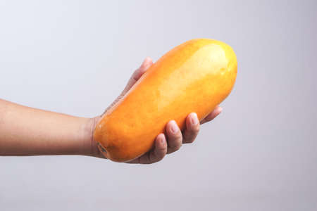 Hand holding fresh papaya with blurred background, papaya assortment with copy space