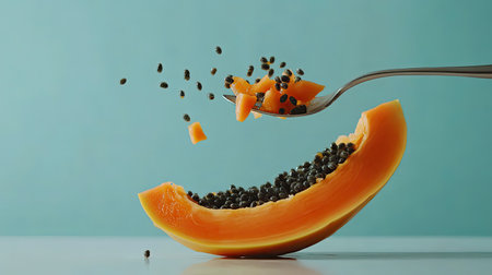 A vibrant image showcasing a fresh papaya slice with its seeds, captured with a fork against a pastel blue background, perfect for healthy eating themes.