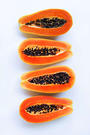 Papaya fruit isolated on white background. Top view. Flat lay.