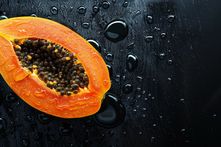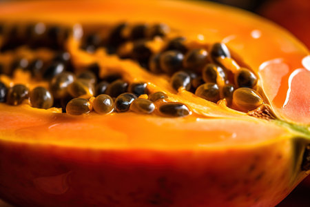 Generative AI, Macro Fresh half of papaya fruit background. Tropical exotic closeup photo with drops