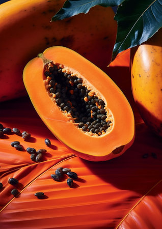 Fresh papaya halves with black seeds placed on vibrant green tropical leaves creating a colorful and healthy food backdrop. Healthy eating and tropical concept.