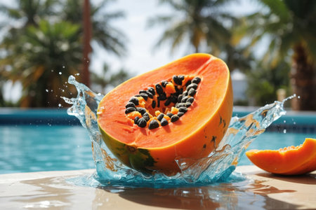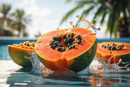 AI Generative Exotic fruit papaya in splashing water on summer swimming pool vacation background