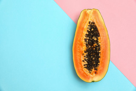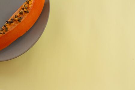 Ripe cut papaya on yellow and gray pastel background. Top view, flat lay, copy space. Tropical, healthy food, women health concept, minimalism.