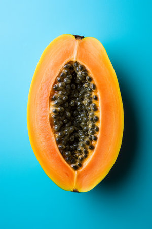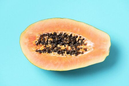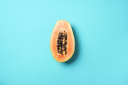 Halved papaya on blue background. Top view. Copy space. Summer time. Tropical travel, exotic fruit. Vegan and vegetarian concept.