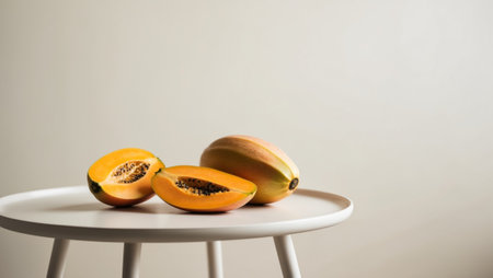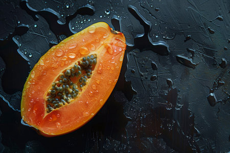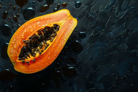 sliced papaya with seeds and leaves on a black background. minimalist style with light yellow and dark gold hues. lively tableaus showcasing traditional craftsmanship by prateep kochabua. bold color blocks and wood elements add depth to the composition. ai generated