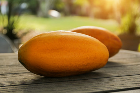 Healthy papaya, food and fruit placed on a wooden table in the warm natural morning.