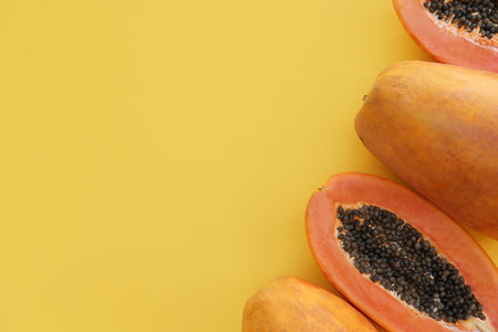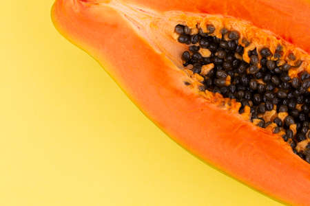 Half ripe papaya fruit with seeds on yellow background, copy space, flat lay