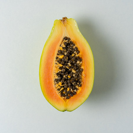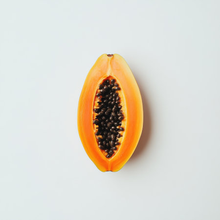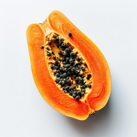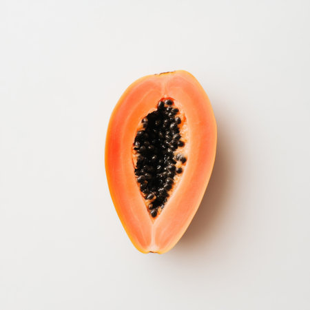A vibrant orange papaya slice showcases its dark seeds against a clean white background, emphasizing freshness and simplicity perfect for nutrition-focused projects.