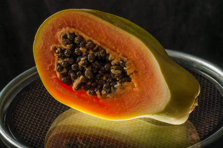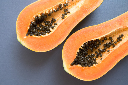 ripe papaya, cut in half papaya, seeds of ripe papaya, juicy orange fruit, natural vitamins, healthy fruit