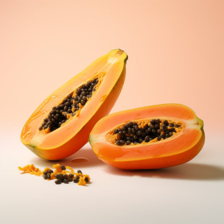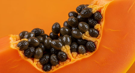 AI Generated. Papaya halves revealing dark seeds spreading across vivid orange surface with playful symmetrical composition
