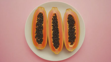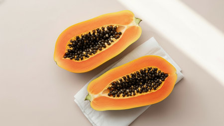 Vibrant papaya halves lay on a white plate, showcasing black seeds and bright orange flesh, perfect for healthy eating visuals in culinary photography.