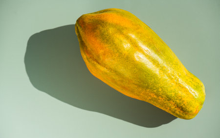 Papaya fruit over green background, whole fresh exotic fruit, fresh organic Papaya exotic fruit art design, close up. Top view, flat lay