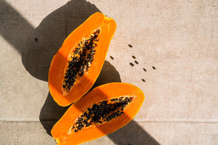 Closeup of halves of ripe papaya fruit with seeds. Ripe fresh papaya fruit on white marble table. Top view. Horizontal shot. Vegan diet, exotic fruits, food concept.