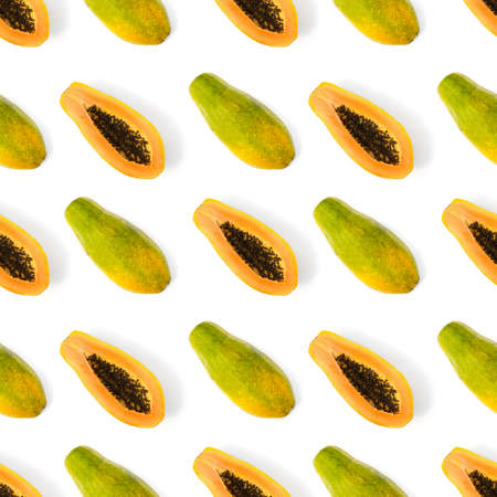 Fresh ripe papaya seamless pattern on white background. Tropical abstract background. Top view. Creative design, minimal flat lay concept. Trend tropical fruit food background pattern