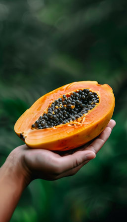 Explore the vibrant beauty of fresh papaya halves resting on lush tropical leaves. This image captures the essence of healthy eating and natural wellness.