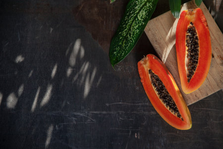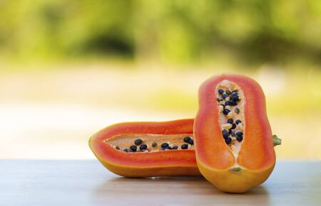 Still life of fresh and juicy tropical fruit on a dark shabby surface and green nature background. Vegan food: orange papaya with black seeds cut lengthwise into two halves. Healthy diet.