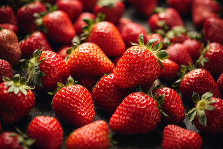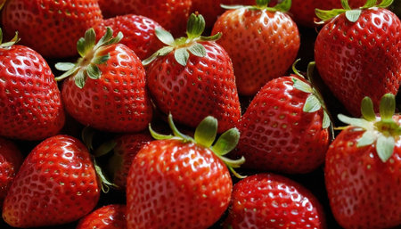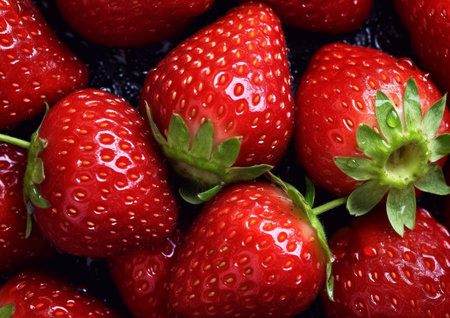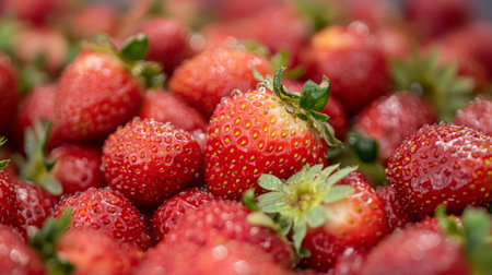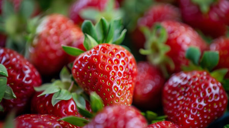 Close-up of ripe strawberries with vibrant red color. The detailed and juicy image is perfect for topics related to freshness, fruit, and healthy eating.