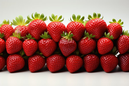 Vibrant red strawberries sit neatly in a row, showcasing their fresh appearance against a minimalist white background. Ideal for food photography and healthy eating themes.