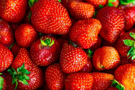 Close-up view of fresh ripe strawberries filling the entire frame, creating a vibrant red fruit background with rich texture and juicy detail for healthy food concepts
